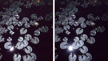こんな現象は聞いたことがないのであわてた。自分の視力もとうとう限界に来たかと落胆もした。でも待てよ、とビュアーの目幅調整をしてみる。フォーカスがずれるので合わせ直すと、立体感はそのままで今度は池がへこんで見えるではないか。ということは、ちょうど良い目幅ポイントがあるはずだ。というわけで目幅を合わせると自然な池の水面が現れた。